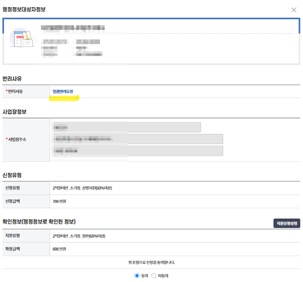 지원금액 수령에 대해 동의 또는 미동의 버튼 클릭