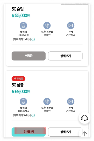 요금상품 변경으로 5G스폰서[심플코스] 혜택이