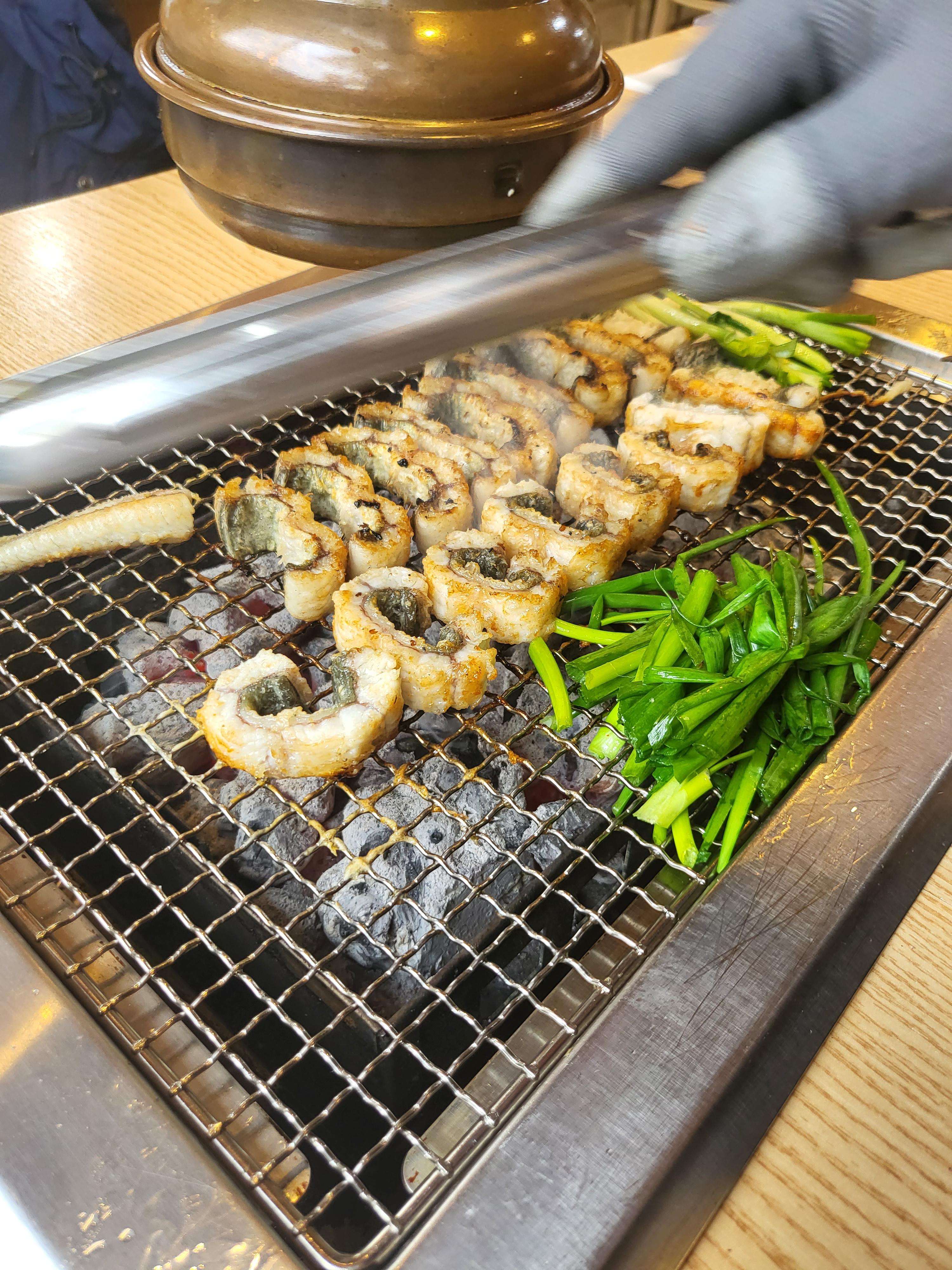 두툼한 장어는 화력 좋은 숯불 불판 위에 올려서 노릇노릇하게 구워줬어요